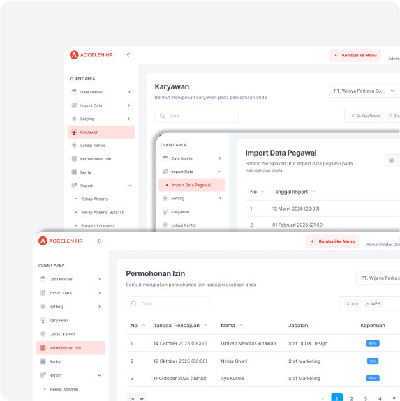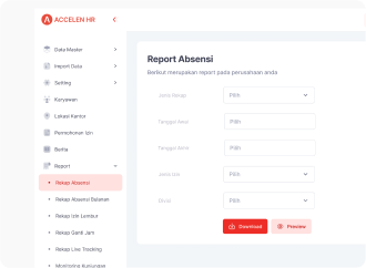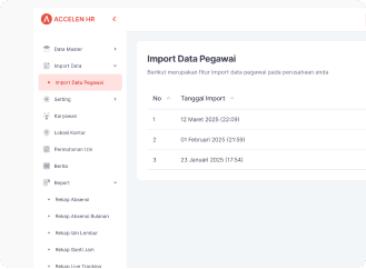 ACCELEN HR adalah sistem digital yang memungkinkan karyawan mengakses dan mengelola data mereka sendiri, seperti absensi, cuti, dan slip gaji, tanpa perlu melalui HR secara manual. Dengan ACCELEN HR, perusahaan dapat mengotomatisasi administrasi karyawan, mengurangi kesalahan pencatatan, serta meningkatkan efisiensi operasional.